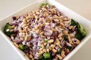 Dressing røres sammen af A-38, sennep, ketchup, citronsaft, salt, peber og sukker. Denne hældes over broccolien. Rødløg skæres i fine tern og hældes over. Pinjekerner ristes. Drysses over umiddelbart før servering. Skal salaten være mere fyldig til f.eks frokostret, kan der ristes bacon og kommes over. Bruges kalkunbacon er salaten stadig fedtfattig. |