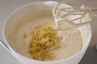 Bland mel, natron og sukker i en skål og smuldr. Smørret i, til blandingen har konsistens som revet ost. Pisk æggehvider, vanille og kærnemælk sammen. Bland ca. halvdelen af væsken med den tørre del, og mix det ca. 1 minut. Hæld resten af væsken i og mix ca 1 minut. Kom den revne citronskal i. Skrab dejen over i en smurt spriongform og bag kagen ca. 45 minutter, til den er gennembagt. Lad den køle af på rist. Rør flormelis og vand sammen, farv glasuren påskegul og smør den på kagen. Pynt med pistacienødder. |