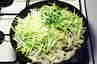 Tag det fra varmen og svits herefter skivet løg, delte hvidløgsfed, fintsnittet porre og peberfrugtstrimler samt fint skivede champignoner.