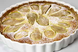 Bland melet og sukkeret. Smuldr det kolde fedtstof heri, til det har konsistens som reven ost. Tilsæt æggeblommer og saml hurtig dejen. Er dejen meget blød kan den hvile i køleskabet ½-1 time. Rul dejen ud og læg den i en tærteform ca. 26 cm. i diameter. Rul kagerullen hen over tærteformens kant, så dejen afskæres pænt. Prik den med en gaffel. Forbag bunden i 10 min i en 200 grader C. alm. ovn. Fyld: Æg, mel, sukker og fløde piskes sammen, den revne marcipan vendes i. Blandingen hældes i tærtebunden Pærerne skrælles og skæres i både. Pæreskiverne trykkes lidt ned i marcipanmassen. Bages ved 200 grader C. alm. ovn 25-30 min. til tærten er gylden. Serveres lun med flødeskum eller cremefraiche. |