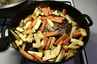 Steg løgene, til de er brune, tilsæt hvidløg, allehånde, enebær, rødvin og vildsvinekølle. Læg låg på, og stil gryden i ovnen i 2 timer ved 200 grader C. Vend kødet, kom rodfrugter ned omkring kødet, og læg låg på igen. Sæt gryden i ovnen endnu 1 timer. Tag kødet op og lad det hvile 20 minutter. Sauce: Fisk grønsagerne op, sigt saucen over i en lille gryde og jævn den med en smørbolle og smag til med salt og peber. spædes evt. op med lidt piskefløde. Vend kartoffelbådene i olie og krydr med salt, peber og timian. Læg dem i en bradebande med bagepapir og steg dem i ovnen ved 225 grader C, til de er møre, ca. 30 minutter. Vend dem undervejs, så de bliver jævnt gyldne. Skær kødet i skiver og læg det midt på et stort fad med rodfrugter omkring. Drys med hakket persille og server med kartofler og evt. brød. |