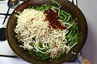 Skær kødet i tynde strimler. Pisk ingredienserne til saucen sammen i en skål. Varm wokken op og slyng olien rundt i den. Svits hvidløg og løg hurtigt til de får lidt farve. Kom lam i tynde strimler og kål i wokken og svits 2-3 minutter. Kom nudler, ærter og bønnespirer i sammen med saucen og varm det hele igennem. Vend hele tiden i det. Smag til med soja og chilisauce og evt. salt og peber. Kom agurken på til sidst evt. sammen med frisk koriander og server straks. |