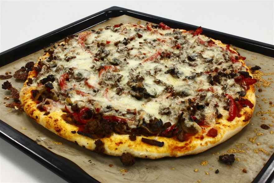 Herefter smøres bunden med dolmio pastasaucen. Husk at syltede grøntsager fra glas skal drænes for så meget væske som muligt for at pizzabunden forbliver sprød. Friske grøntsager som indeholder meget vand eks. champignon løg rød/grønpeber kan med fordel steges påforhånd for at holde fyldet så tørt som muligt. Man kan selvfølgelig anvende hvilken som helst ost, revet mozzarella er ganske udemærket men jo bedre ost, jo bedre pizza. Mellemlagret ost revet i mindre stykker eller gorgonzola er mums. Fyldet fordeles jævnt henover pizzen. Først kødet og derefter grøntsagerne. Til sidst drysses med krydderierne og der dryppes lidt oliven olie henover fyldet. Pizzaén bages i 20-30 min ved 220 grader C. alm. ovn hold godt øje med bunden, når kanten er gylden og sprød (det er svært at angive nøjagtig tid da det afhænger meget af ovnen). Herefter kommes osten på og pizzaén er klar når osten er smeltet ca. efter 5-10 min. |