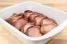 Kogt hamburgerryg i skiver lægges i bunden af et ildfast fad.