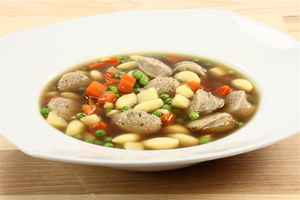 Medisteren skæres i skiver og tilsættes suppen umiddelbart før servering.