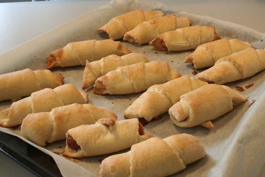 Slå dejen ned og del den i 2. Rul hver klump ud til cirkler og del i 8 trekanter. Smør evt. ketchup eller sennep. Skær pølserne midt over og rul en halv i hver. Lægges på en bageplade og efterhæver ca 20 minutter. Bages i ca 15 minutter ved 200 grader C. alm. ovn. |