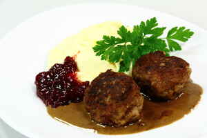 Dæmp varmen og svits hakkede løg let. Bland fløde æg salt peber og merian. Tilsæt det hakkede kød, bacon, løg og hvedemel og ælt det hele godt sammen. Farsen formes til frikadeller som steges på svag varme 5-6 minutter på hver side. Drys hvedemel panden og rør det ud i det overskudende fedt. Tilsæt kogevand fra kartoflerne indtil tilpas tykkelse, tilsæt piskefløde og evt. en bouillonterning samt kulør. Smag til med salt peber og syltede tyttebær. Serveres med kartoffelmos og evt. syltede tyttebær til. |