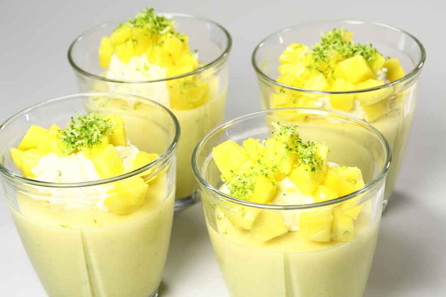 Skær de modne mangofrugter igennem på langs. Skræl tre af de halve mangofrugter og skær kødet i mindre stykker. Den 4. gemmes til pynt. Kom 1/3 af mangokødet i en kasserolle med appelsinsaft, vand og halvdelen af sukkeret. Læg låg på og kog ved svag varme i ca. 10 minutter til en kompot. Tag kasserollen af varmen. Vrid vandet af husblassen og rør den i kompotten. Kom resten af det rå mangokød i blenderen sammen med kompotten og blend til en jævn puré. Hæld pureen tilbage i kasserollen og tilsæt resten af sukkeret og æggeblommerne. Sæt det over på lavt blus og rør konstant til det tykner som en creme. Cremen må ikke nærme sig kogepunktet. Tag kasserollen af varmen (forsæt med at røre). Afkøl cremen til den er lunken. Rør jævnligt. Pisk fløden stiv med 1 tsk. sukker og vend den i mangocremen sammen med Grand Marnier eller Grand Marnier og reven skal af halvdelen af limefrugten. Fordel cremen i glas og stil koldt i 6-7 timer. Pynt med flødeskum, den resterende 1/3 mango og lidt reven limeskal. |