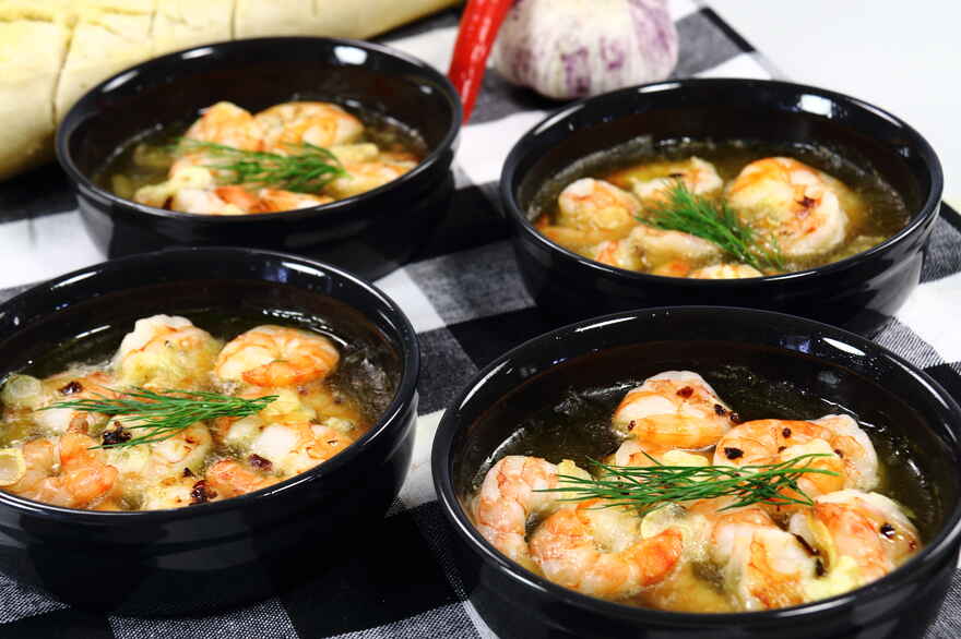Læg hvidløg i tynde skiver og chilipeber ved og drys med lidt salt og evt. cayennepeber (alt efter hvor stærkt man vil have det). Olivenolie hældes over, så rejerne lige er dækket. Skålene sættes i ovnen ved 250 grader C. alm. ovn midt i ovnen ca. 10 minutter, så olien kommer til at koge. Serveres straks med flutes til, som man dypper i olien, så man får det med op. |