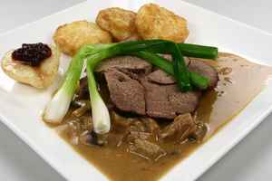 Svampesauce: De rensede og udskårne svampe ristes i resten af smørret. Stegen tages op, hviler tildækket i mindst 10 minutter. Stegefonden hældes op i svampene. Saucen tilsmages med salt, peber og balsamisk eddike og jævnes med creme fraiche. Tilbehør: Server med rösti og pærer med tyttebær. |