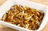 Kog kyllingen til kødet slipper skroget. Pil kyllingen og del kødet ud i små stykker og fordel det i et ovnfast fad. Drys med salt, peber og karry efter smag.