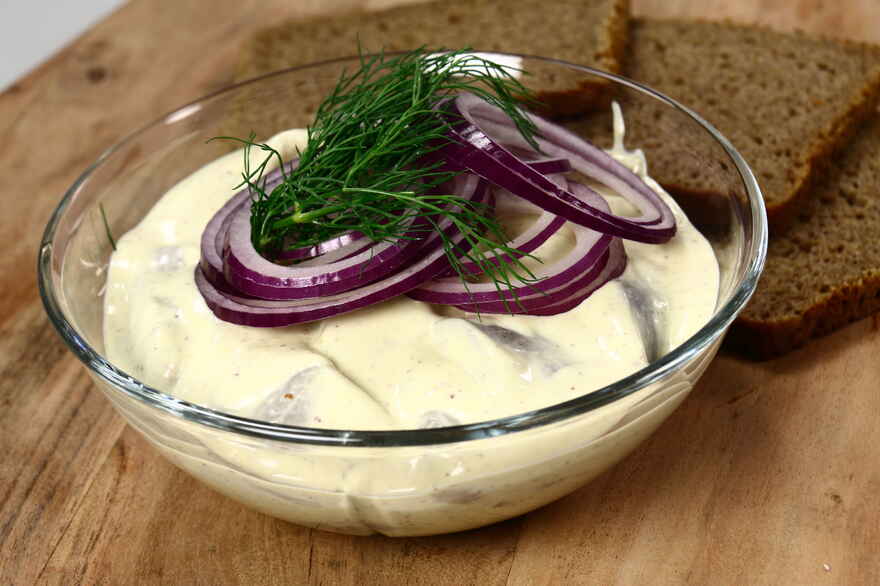 Bland cremefraiche, mayonnaise, sennep og gurkemeje. Skær silden i bidder og vend dem i dressingen. Ved servering pyntes med løgringe og dild |