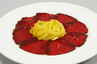 Skær løgene i skiver og sauter dem et øjeblik i lidt vand og smør. Dryp løgskiverne af og kog dem i appelsinsaften til de er helt møre og væden godt indkogt ca. ½ time. Smag til med salt og peber og køl af. Blancher den fint revne appelsinskal i lidt vand og hæld det fra. Før serveringen hældes evt. overskydende væde fra løgene, og de blandes med appelsinskal. Marineret oksemørbrad: Mørbraden smøres med alle krydderierne, der er rørt i senneppen. Den lægges på et stykke stanniol, og cognac dryppes over. Mørbraden indpakkes og marinerer i to døgn i køleskabet. Vendes af og til. Mørbraden nedfryses og skæres i meget tynde skiver (bedst på maskine) mens den endnu er frossen. Serveres med appelsinløg. En tør rosevin passer godt til. |