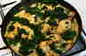 Olien varmes op i en stor gryde eller dyb pande med låg. Brun kyllingelårene ved høj varme. Sænk temperaturen og lad løg og hvidløg stege med under omrøring i nogle minutter. Oregano, salt og peber strøs over. Hæld vinen ved og lad det hele koge op. kog under låg ved svag varme i ca. 20-30 minutter. I mellemtiden tøes spinaten op efter anvisningen på pakken. Når kyllingelårene er færdige blandes knuget spinat forsigtigt ved. Kog videre i ca. 1 minut. Server retten direkte fra panden med f.eks. pasta. |