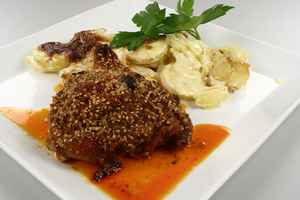 Olie og det pressede hvidløg, paprika, salt og timian blandes. Med denne blanding pensles kyllingelårene, som derpå vendes i en blanding af rasp og sesamfrø.