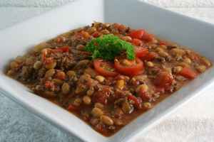 Når vandet er kogt væk svitses oksefarsen med. De hakkede tomater, Baked beans, mælk, hvidløg og hakkede peberfrugter hældes ved kødet/løg. Der smages til med cayenne peber, chili, spidskomme, salt og peber. Lad det simre i ca. en ½ time. Tips: Chilli con carne er en mexicansk suppe, der spises med ske. Serveres med groft brød. |