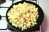 Skær løgene i tern og svits dem klare i smør. Når de har taget en anelse farve, kommes kartoffelstykkerne på.