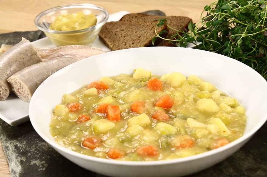 Flæsket lægges i en gryde med rigeligt letsaltet vand og bringes i kog, og skummes grundigt. Koges til det er mørt, ca. 2 timer. Kartofler og urterne skæres i tern porrerne i skiver, og koges sammen med flæsket i ca. 20 minutter, tages op. Medisterpølsen koger ca. 5 minutter sammen med flæsket. Ærterne koges ca. 1 1/4 time i rigeligt vand sammen med løg og timian. Ærterne gnides gennem sigten og spædes med suppen fra flæsket. Kartofler og urter kommes i det hele gives et opkog og smages til med salt. Servers med brød, sennep og til fest rigeligt med snaps. Tips: Møllerens Gule Ærter tilsættes direkte til suppen fra flæsket og skal blot koges op før de jævner og så ca. 10 minutters kogning inden urterne tilsættes. |