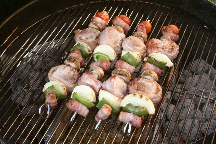 Rens champignonerne. Rens løgene og del dem i kvarte. Rens peberfrugten og skær den i 8 stykker. Lad cocktailpølserne dryppe af og rul en halv skive bacon om hver. Hvert spyd består af to stykker kød, 2 kvarte løg, 2 cherrytomater, 2 champignon, 2 stykker peberfrugt og 4 cocktailpølser, der fordeles pænt på spyddet. Risten smøres med olie og spyddene grilles. |