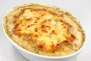 Løgene skæres i ringe og steges blanke på panden i resten af smørret sammen med champignonerne, der er renset og skåret i skiver. Rasp, fløde og vin tilsættes og krydres med salt og peber efter smag. Det hele gives et opkog og hældes over mørbraden i fadet. Tomaterne skæres i tynde skiver og fordeles over retten. Til sidst drysses den revne ost over. Fadet sættes i ovnen ved 200 grader C alm. ovn i ca. 20 minutter, eller til osten er blevet gylden. Servers med kogte ris og en god salat. |