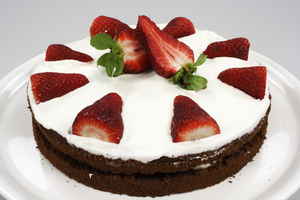 Hæld dejen i en smurt springform, og bag kagen på nederste rille i en 175 grader C. alm. ovn i ca. 45 min. Kagen deles i to, og bananskiver fordeles imellem de to lag. Fløden piskes stiv, og fordeles i et tyndt lag oven på kagen. Pynt med hele jordbær. |