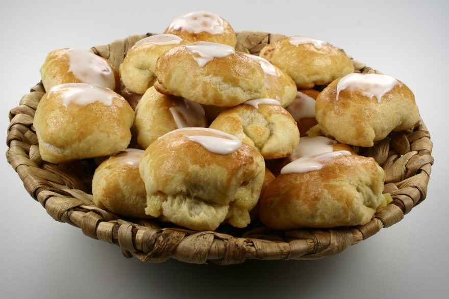 Mælk og gær opløses. Smør, æg kardemomme og mel blandes i. Æltes i 5 minutter Hviler i køleskab i 20 minutter. Cremen: Fløde og mælk blandes sammen. Tilsæt halvdelen af sukkeret. Kog langsomt op. Pisk æggeblommerluftigt med maizena og resten af sukkeret Når mælken koger hældes den forsigtigt i æggemassen under piskning Hæld det hele tilbage i gryden og varm det forsigtigt op, tages af varmen og smages til med vanillesukker. Hæld cremen i en skål og stil den til afkøling. Rul halvdelen af dejen ud og skær den ud i firkanter på ca. 10x10 cm. ca. 12 stk. Læg lidt creme på midt på hver firkant. Luk omhyggeligt enderne sammen Sæt bollerne på pladen med samlingen nedad. Det samme gøres med den anden halvdel af dejen. Bollerne stilles til hævning i ca.1 time. Bollerne pensles med æg. Bages ved 225 grader C. alm. ovn i ca. 12 minutter. Glasur røres af flormelis og kogende vand til passende konsistens, og glasuren fordeles på bollerne. Tips: I stedet for creme kan der bruges Marcipan masse: 125 g. sukker 125 g. smør 125 g. marcipan der kan også bruges marmelade i midten. |