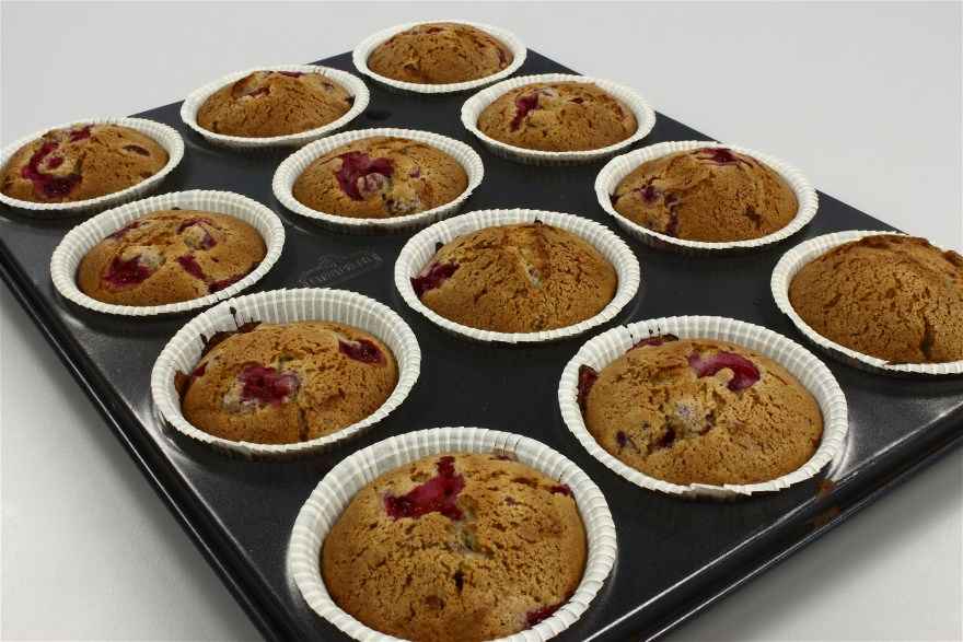 Pisk sukker og æg lyst og skummende. Tilsæt fedtstof og mælk og rør godt. Sigt mel, bagepulver, kardemomme og søddemidel sammen og rør blandingen i dejen og pisk, til der ikke er nogen klumper. Vend ribsene i mel og bland dem i dejen. Fordel dejen i 12 muffinsforme og bag dem midt i ovnen 20-25 min. Tag de bagte muffins ud af ovnen og lad dem køle af på en rist. Bland vand og flormelis og rør. Fordel glasuren på de 12 muffins. Tips: Den lille mængde sukker er ok for en diabetiker. Du kan bruge solbær i stedet for ribs og lave glasuren af 3 spsk flormelis, ½ tsk vand og ½ tsk romessens. De færdige muffins kan fryses. |