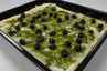 Ælt dejen grundigt i 5 min. Dæk dejen med et fugtigt viskestykke og lad den hæve til dobbelt størrelse. Æltes igen og efterhæver i 15 min. Rul dejen meget tyndt ud, læg den på en bageplade med bagepapir eller på en pizzasten. Smør en lille smule af pestoblandingen på. Læg kartoffelskiverne på i et pænt spiral mønster. Smør resten af pestoblandingen på. Fordel en håndfuld sorte oliven på (kan undlades) Bages ved ca. 300 grader C. alm. ovn i 10 minutter eller til den er gyldenbrun i kanten. Tips: Smager også godt med lidt frisk rosmarin på. |