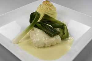 Damp hvillingen i 8 min sammen med forårsløgene. Tilbered hollandaise efter angivelsen på pakken. Anret fileterne og forårsløg på tallerkener med øre, hæld hollandaisen over og gril dem i ovnen til de bliver gyldne. Pynt med de dampede forårsløg. Server de varme tallerkner som de er. Hvis det ønskes kan man spise salat eller flutes til. Tips: Drys evt med revet parmesan over sauce og fisk inden gratinereing. |
