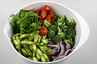 Rucola skylles og blandes med rødløg i tynde både, halve cherrytomater, små broccoli buketter og friske asparges i 3 cm lange stykker.