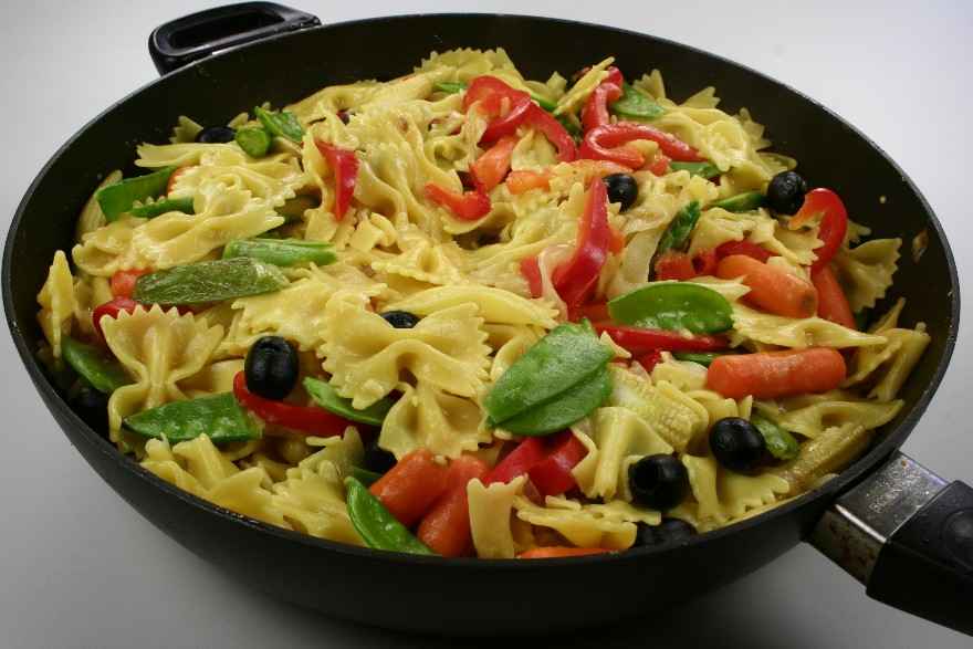 Varm resten af olien på en stor pande og svits hvidløg og løg blødt i ca. 3 minutter. Tilsæt peberfrugt, karotter og minimajs og rør det sammen. Svits 2-3 minutter. Rør derefter sukkerærter, asparges, sorte oliven og farfalle i. Svitses 2-3 minutter. Mel drysses over og røres sammen med grøntsagerne i 1 minut. Derefter hældes lidt efter lidt 4.5 dl. af det gemte kogevand ved. Koges i 2-3 minutter eller til saucen koger og er jævnet. Serveres i panden eller hældes i et varmt fad. |