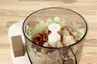 Hak løget, kom bacon og torsk i. Når kødet er grovhakket kommes mel, salt (obs. baconen salter), peber i. Kom derefter mælken i lidt af gangen imens det hele kører videre til fiskefarsen har en tyk lind konsistens.