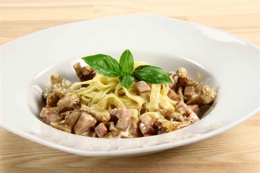 Kantareller i oste-flødesovs med skinke
