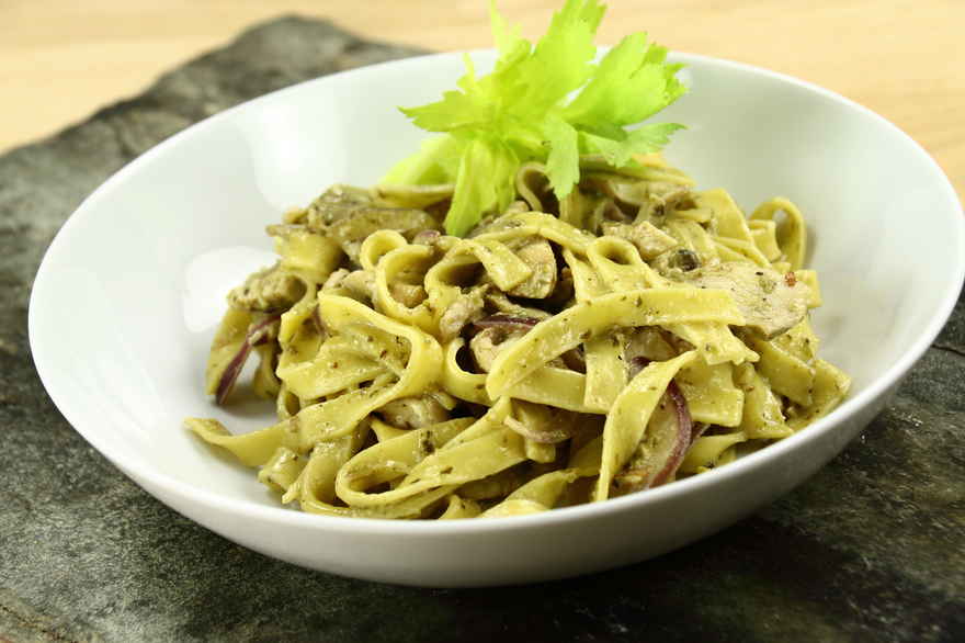 Kyllingestykkerne marineres i olie sammen med det skårede rødløg, hvidløg samt salt. Skal stå i min. 20 minutter. Pastaen sættes til kog. Kødet med marinaden steges i en wok. Herefter skal den færdige pasta i. De to tsk. grøn pesto blandes nu sammen med kødet og pastaen. Lige inden servering hældes 2 dl mælk i, som hurtigt koger ind i pastaen, og giver hele retten en cremet konsistens. Tips: Mængden af pesto kan reguleres efter smag. De fleste ingredienser kan skiftes ud og nye kan komme i retten, alt efter smag. |