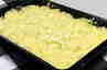 Kartofler, løg, smeltet smør, salt og peber vendes sammen, det gøres nemmest med hænderne evt. i et æltefad, sørg for at få skilt alle kartoffelskiverne fra hinanden. Blandingen hældes i en bradepande beklædt med bagepapir ca. 23x33 cm. læg et stykke bagepapir over og stil den i ovnen ved 130 grader C. alm. ovn ca. 2 timer til kartoflerne er møre. Prik gerne i kartoflerne med et kødspyd for at mærke om de er møre. Tag bradepanden ud af ovnen og stil en anden bradepande oven på som pres, fyld den gerne med noget tungt og stil det i køleskabet til næste dag. Gerne med en større bradepande eller fad under da smørret kan rende over. Når kartoflerne skal bruges så løsnes de fra kanten af bradepanden, og bradepanden varmes let i bunden (på kogeplade), kun lige så den giver slip. Vendes ud på et skærebræt og skæres i passende stykker. Stykkerne lægges på bageplade eller bradepande og stilles i ovnen ved 150 grader C. alm. ovn i minutter til de er gennemvarme ca. 30 minutter på næstøverste rille. Hvis kartoflerne ikke har taget farve kan der skrues op for varmen, evt. sættes under grill. |