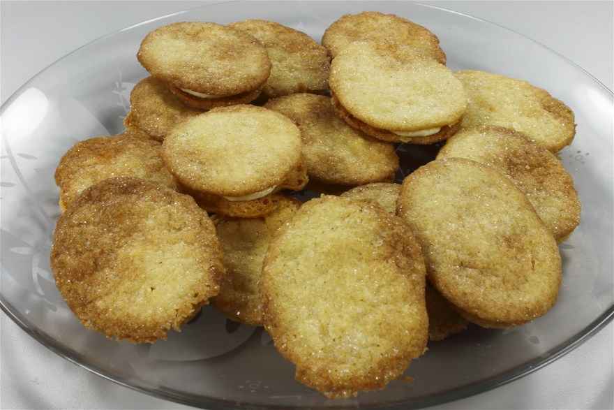 Skær det kolde smør i mindre stykker og smuldr det i melet. Saml hurtigt dejen. Stil den tildækket i køleskabet i mindst ½ time. Rul dejen ud på et meldrysset bord til en ca. ½ cm tyk dejplade. Stik runde kager ud med en dejstikker ( ca 4½ cm i diameter). Saml den overskydende dej og gentag udstikningen, til der er ca. 32 kager. Læg kagerne med overfladen nedad på sukkerdrysset bagepapir. Rul kagerne let med en kagerulle, så de bliver til ovale vafler. Læg dem med sukkersiden opad på en plade med bagepapir. Bag vaflerne midt i ovnen ca, 8 minutter ved 200 grader C. alm. ovn. Lad dem køle af. Smørcreme: Rør flormelis og kogende vand sammen, og pisk det bløde smør i glasuren lidt efter lidt. Læg vaflerne sammen med smørcremen. |