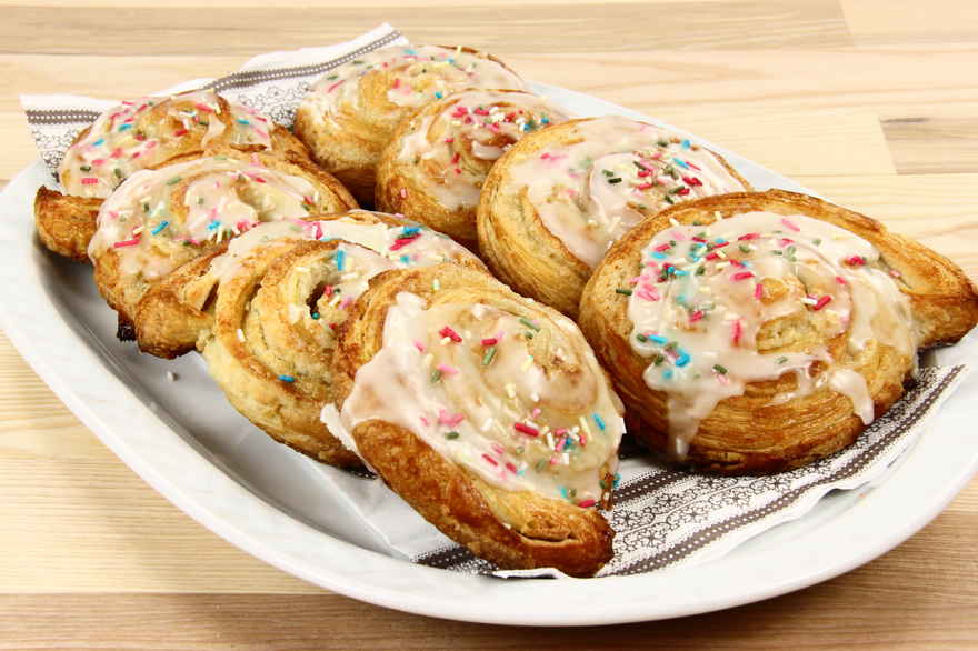 Den færdige dej udrulles i plade på 60x40 cm. ca. ½ cm. tykkelse Ingredienserne til Borgmestermasse røres sammen og smøres på dejen i et jævnt lag. Dejen rulles sammen fra den lange led og skæres i ca. 2 cm. skiver som lægges på en bageplade og trykkes let flade. Bages ved 225 grader C. alm. ovn i 12-15 minutter. Når sneglene er afkølede blandes glasur som fordeles over og drysses hurtigt efter med blandet sukkerkrymmel, så glasuren ikke når at stivne. |