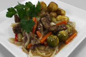 Retten simrer under låg til kødet er mørt ca. 45 min. Løgene skæres i tynde skiver og pastinak i strimler. Rosenkålene gøres i stand. Grøntsagerne tilsættes retten og det hele koger ca. 15 min. mere. Smag til med lidt chilli, salt og peber. Serveres med Brød og/eller kartofler. |