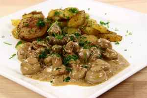 Bouillon, salt, peber og sukker tilsættes. Steger under låg ca. 45 minutter. Champignon, fløde og kulør tilsættes. Serveres med kogte kartofler eller kartoffelmos. |