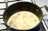 Afkøl kyllingen i kogevandet, tag derefter kødet af benene og skær det i mindre stykker. Afdryp asparges i en sigte gem aspargesvandet. Smørret smeltes i en gryde. Tilsæt mel og rør det i, lad det riste let inden en blanding af aspargesvand og kyllingefond (5 dl.) tilsættes under konstant omrøring. Tilsæt piskefløde og kog op. Smag til med salt og peber. Stuvning skal være tykkere end du lige tror da der stadig er en del være i aspargeserne. Til slut tilsættes aspargessnitter og kyllingekød. Serveres med kartofler. |