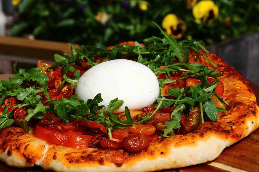 Udblød gæren i det kolde vand, og ælt det sammen med resten af ingredienserne i minimum 5 min. Stil i køleskab og lad gerne stå i minimum 3 timer, men allerhelst natten over. Skal stå filmoverdækket, så tæt som muligt. Tag dejen ud ca. 2 timer før pizzaen skal være færdig. Bagte tomater: Tomaterne halveres og lægges på en bageplade. Krydres med salt, peber og oregano. Sættes i ovnen ved 150 grader C. Alm. ovn i 1½ time. Tomaterne tages ud og ovnen skrues op på max. Rul eller tryk dejen ud. Fordel pizzasauce på bunden og drys reven ost over. Skær friske tomater i skiver og læg på dejen og bag den ved ca. 275 grader C alm. ovn 10-12 minutter. Pizzaen tages ud og de bagte tomater fordeles over bunden, fordel også lidt rucolasalat og i midten placeren Burrata. Tips: Burrata minder smagsmæssigt om frisk mozzarella men er blødere med en hinde omkring. Den skæres først når den skal spises. |