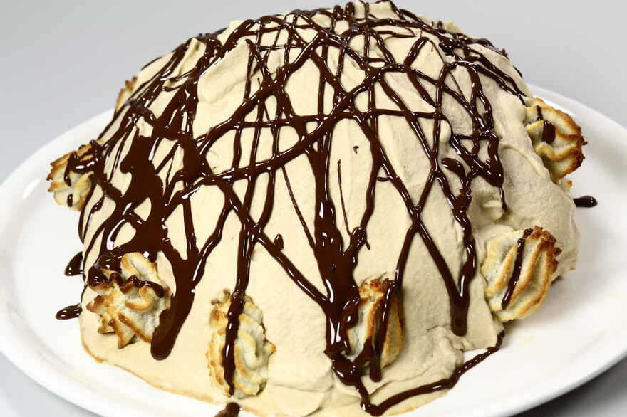 Flormelis sigtes ned i marcipanmassen, og den æltes med æggehviderne lidt ad gangen i en tykbundet gryde. Konsistensen skal blive sådan, at man kan se, at det akkurat kan lade sig gøre at sprøjte massen ud gennem sprøjtepose. Blandingen skal først varmes op over lav varme, mens der hele tiden røres godt, og den skal blive så varm, at man lige kan "brænde" fingrene på den. Massen er nu lidt mere lind end i kold stand, men den bliver hurtigt fastere, derfor gælder det om så hurtigt som muligt, at fylde (godt halvdelen) i et stort papirkræmmerhus af dobbelt lag bagepapir, hvori der klippes et lille hul i spidsen og sættes en sprøjtetylle i. Kræmmerhuset kan holdes sammen med en nål. Den løse bund til en springform ca. 23 cm. i diameter pensles med smør og drysses let med mel. Herpå smøres først et jævnt lag af kransekagedejen, hvorpå der sprøjtes en kant hele vejen rundt fra posen. Der skulle gerne blive lidt dej tilbage i posen, den sprøjtes ud i små toppe på bagepapiret og bages for sig til at pynte tærten med. Kransekagetærten sættes i oven ved 220 grader C. og bages ca. 10 min. Toppene 7-8 min. Skulle kanten på tærten blive brun før bunden, kan man lægge en tilklippet ring af alufolie over, når kanten er lysebrun - og så give tærten nogle minutter mere. Når tærten er afkølet lidt, løsnes den forsigtigt fra formen. Chokolade: Chokoladen brækkes i stykker og smeltes i en gryde over svag varme. ca. ¾ af den smøres i et jævnt lag på tærtebunden. Den sidste chokolade gemmes til pynt. Frugt: De afdryppede frugter skæres i mindres stykker og lægges i et lag på tærtebunden. Creme: Den piskede fløde vendes med Kahlua. Flødeskummet lægges oven på frugterne. Derefter endnu et lag frugt. Kransekagetoppene lægges på som pynt over frugt og fløde. Resten af chokoladen fyldes i et kræmmerhus og tærten sprøjtes over med chokolade. |