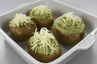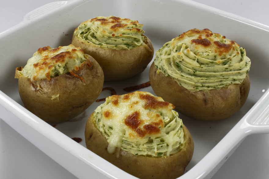 Fadet tages ud af ovnen, og kartoflerne afkøles, til de er til at røre ved. Skær toppen af kartoflerne og udhul forsigtigt kartoflerne med en teske, så skallen ikke går i stykker. Kartoffelfyldet moses og blandes med æggeblommerne, persille, revet muskatnød, salt og peber. Æggehviderne piskes stive og vendes forsigtigt i kartoffelmassen. Kartoffelblandingen fyldes i de tomme kartoffelskaller. Der bliver top på. Drys den revne ost over de fyldte kartofler, som sættes tilbage på fadet. Sæt fadet i ovnen igen i endnu 10 min. indtil osten er gylden Server for eksempel tomatsalat til. |