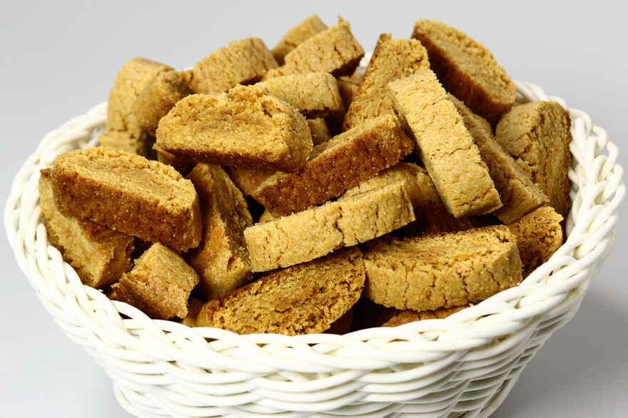 Del dejen i 4 lige store stykker. Tril til stænger ca. 40 cm lange eller hvilken længde der passer til bagepladen. Læg stængerne på en bageplade med bagepapir og bag dem på midterste rille i alm ovn ved 200 grader C. Alm. ovn i 15- 20 minutter. Tag stængerne ud og lad dem afkøle lidt. Dæmp ovnvarmen til 125 grader C. alm. ovn. Skær kagerne forsigtigt ud i små skiver. ca. 25 i hver stang (ca. 1.5 cm.). Vend dem en kvart omgang så de lægger på skærefladen og stil dem tilbage på bagepladen med lidt mellemrum mellem kagerne. Tør dem midt i ovnen ved 125 grader C. Alm. ovn i ca. 2 timer. Tips: Kaldes også for Danske Biscotti. Stængerne kan evt. drysses med kanelsukker inden de stilles i ovnen første gang. |