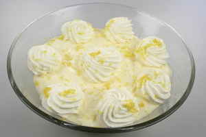 Når blandingen begynder at blive jævn, vendes flødeskummet deri. Derpå vendes de stiftpiskede æggehvider forsigtigt i. Fromagen fyldes i en skål og dækkes med flødeskum. |