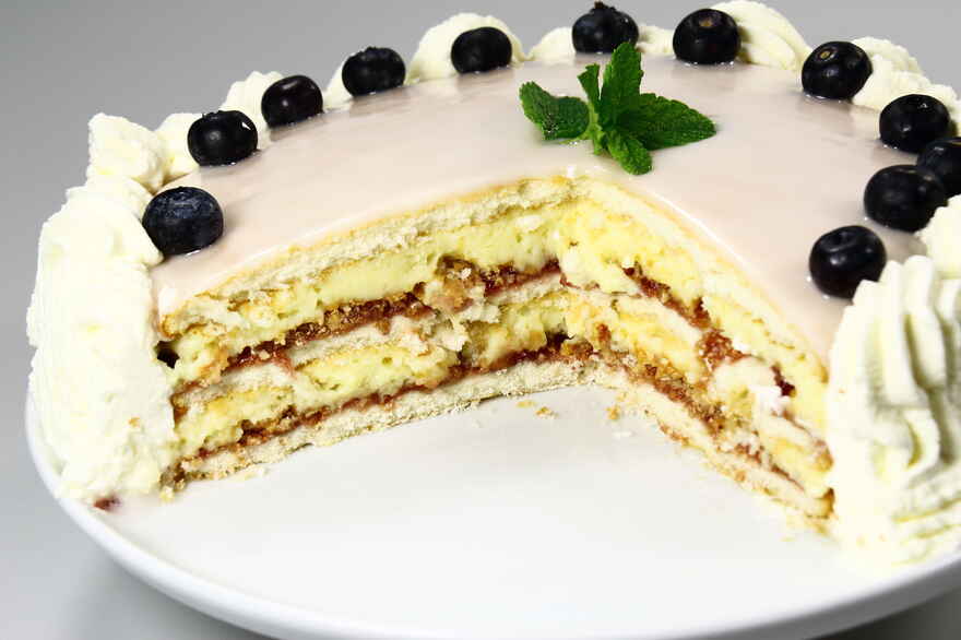 Start med cremen. Æggeblommer, sukker og vanilje piskes sammen, derefter piskes maizena og 1 dl. af mælken i. Resten af mælken koges, hvorefter cremeblandingen kommes i og piskes godt igennem til det tykner. Hæld derefter cremen i en skål, så den ikke brænder på. Afkøles helt. Cremen skal anvendes samme eller næste dag. Knus makronerne, og stænk dem med likør. Smør to lagkagebunde med marmelade, og læg dem sammen med markroner og flødecreme. Læg den sidste lagkagebund øverst, tryk let sammen, og dæk kagen med film. Stil kagen koldt i mindst 3 timer og gerne til næste dag. Glasur eller flødeskum: Pisk fløden til skum, og smør et tyndt lag på kagens overflade. Fyld resten i en sprøjtepose, og sprøjt pynt på top og sider. Eller lav en glasur af 200 g. flormelis og varmt vand. Pynt med frisk frugt. |