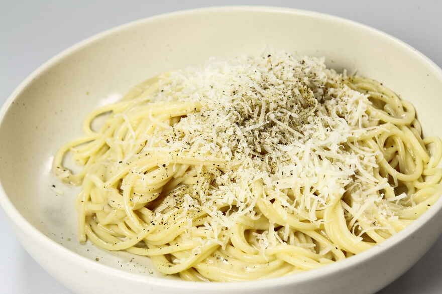 I mellemtiden rives osten, kværn peber over osten og vend det rundt. Vend den kogte spaghetti i den revne ost, vend lidt kogevand fra spaghettien i. Server straks med lidt revet ost og friskkværnet peber på toppen. Tips: Cacio=ost Pepe=peber. Det er vigtigt at bruge Pecorino Romano da den smelter nemt og det giver en dejlig cremet pasta. |