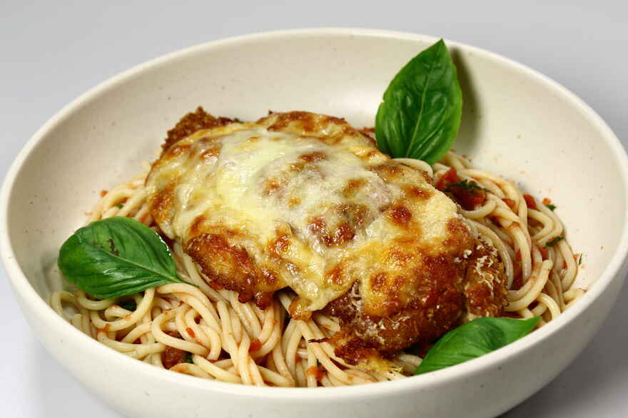 Skær kyllingebrysterne igennem på langs så du har 6 flade stykker kylling. Bank kyllingestykkerne let så de har en ensartet tykkelse. Krydr. med salt og peber. Panering: Bland rasp og den ene portion revet parmesan. Pisk æggene godt sammen. Kom rasp, æg og mel i hver deres fad eller tallerken. Vend kyllingestykkerne først i mel, så æg og til sidst rasp. >BR> Lægges til side. Varm olien i en dyb pande og steg kyllingestykkerne 2-3 stykker af gangen ca. 4 minutter på hver side. Lægges i ildfast fad, bradepande eller bageplade. Læg nu ca. 2 spsk. tomatsauce eller hakket tomat på kyllingestykkerne. Drys revet mozzarella over og tip med den sidste portion revet parmesan. Sættes i ovnen 15-20 minutter til osten er blevet gylden og kyllingen er gennemstegt. Serveres med spaghetti vendt med den sidste tomatsauce eller med smør. |