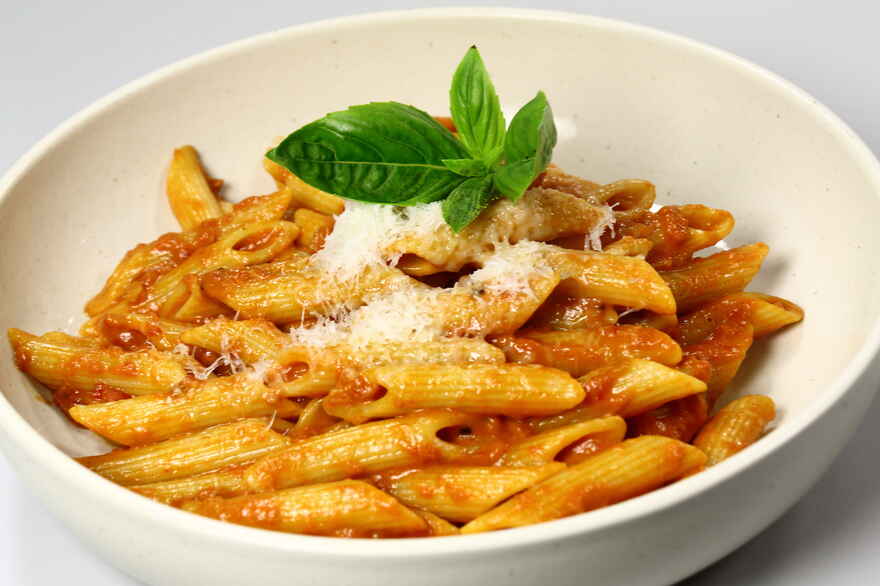 Tilsæt tomatpure og vodka og sauter i 2 minutter til det meste af vodkaen er fordampet. Tilsæt tomater og chiliflager og lad saucen simre under låg ved svag varme i ca. 15 minutter. I mellemtiden koges pastaen i rigeligt letsaltet vand så den er klar samtidig med din sauce. Tag 2 dl. kogevand fra til saucen. Rør piskefløde og revet ost i saucen og lad det lige koge op. Tilsæt pastaen og spæd op med kogevand til saucen har en tilpas konsistens. Server retten med revet ost på toppen og pynt af med basilikum eller persille. |