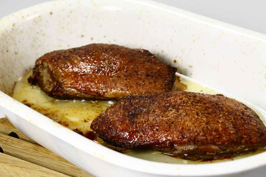 Lægges i karet som allerede har temperaturen og gives 36 timer ved 69 grader C. Lægges i køleskab indtil brug. Opvarm andebrystet i ovnen ved 180 grader i cirka 15-20 minutter, indtil skindet er sprødt. |